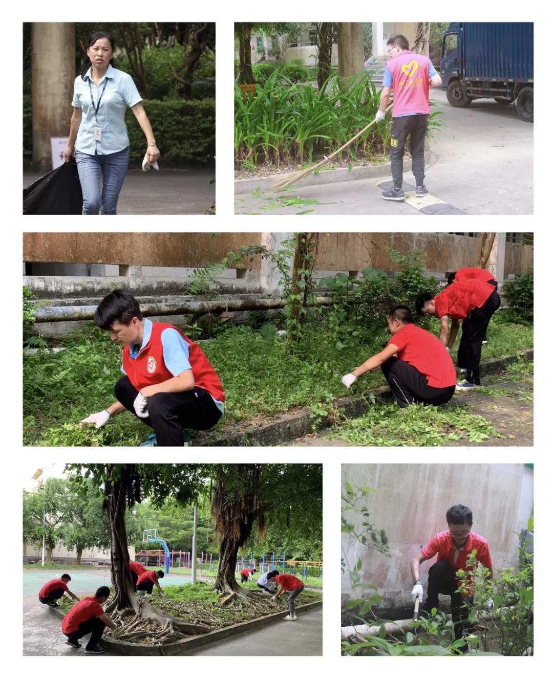 篮球场、教学楼、宿舍楼是学生频繁出入的地方,为了给新生们创造良好的学习生活环境,师生们更是铆足了劲,运用拔、扫、拖、抬等各般武艺,不放过任何一个卫生死角,校园中到处都可以看到大家全力奋战的身影。