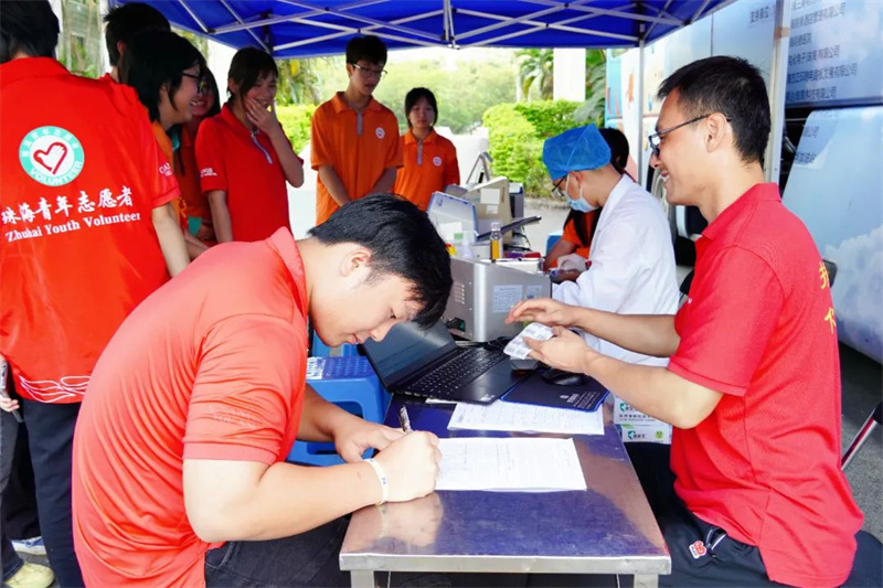 中午,珠海市中心血站的献血车开进了校园。团委学生会的同学们与珠海中心血站的医护人员行动起来,迅速搭建好献血工作台,做好一切设备物资准备。