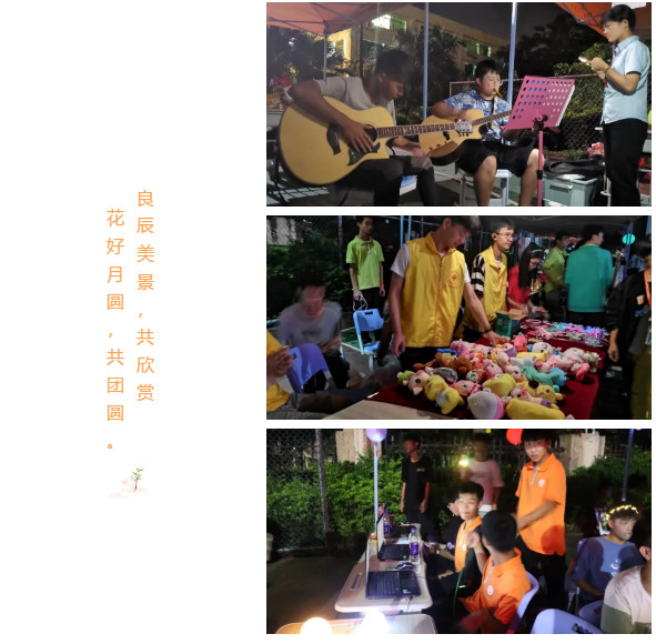 有售卖自制小食饮料的、有现场做起水果沙律的、有的则开启了夜市烧烤档,吸引了同学们驻足不前;班级的销售员在小店门前尽展花式促销,妙语连珠引来顾客不断,欢声笑语不绝耳;套礼品、夹弹珠,射箭等小游戏引来阵阵欢笑声;更有益智小游戏,如猜灯谜,猜歌曲,大家齐聚帮忙出谋划策,围得摊位水泄不通,好不热闹。庙会活动用心用情,陪大家度过一个美好的中秋佳节。