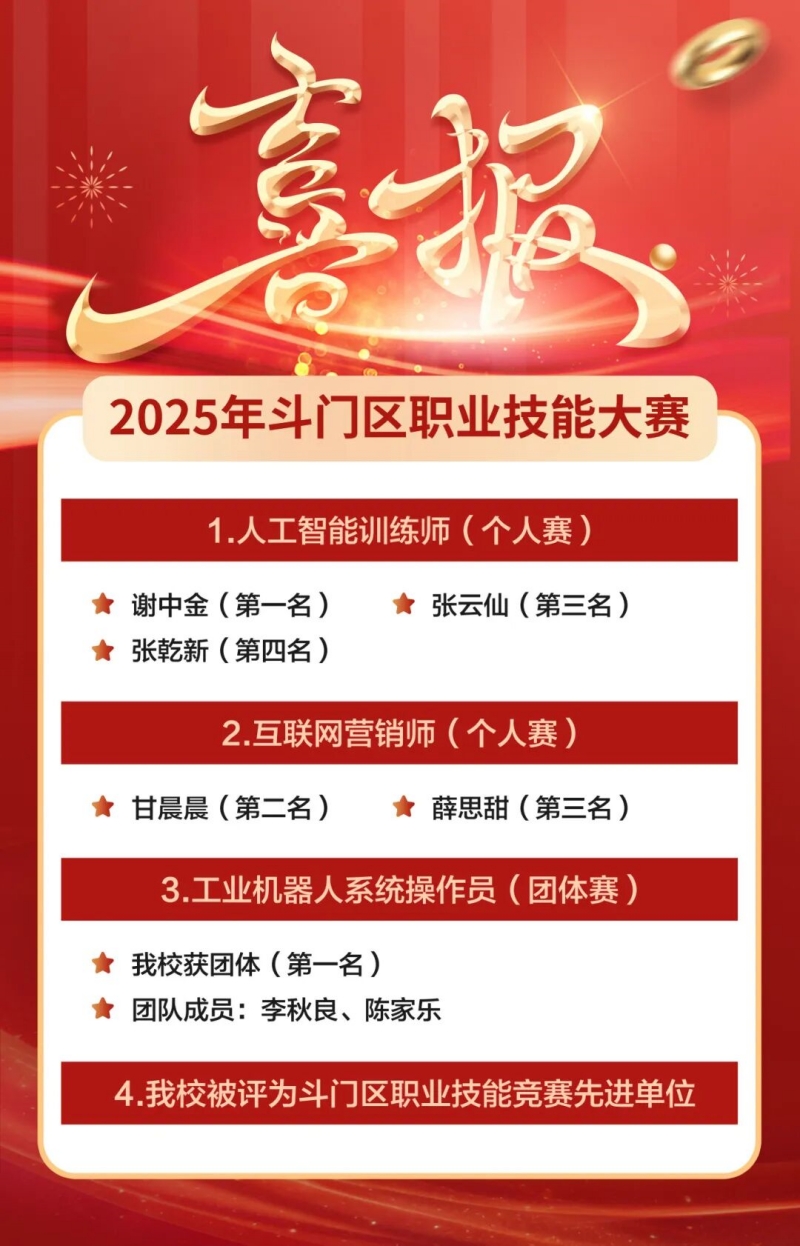 从课堂到赛场,从理论到实践,这份亮眼的成绩单正是我校深化产教融合、创新育人模式的最佳印证。让我们为在2025年斗门区职业技能大赛中取得优异成绩的师生们喝彩!