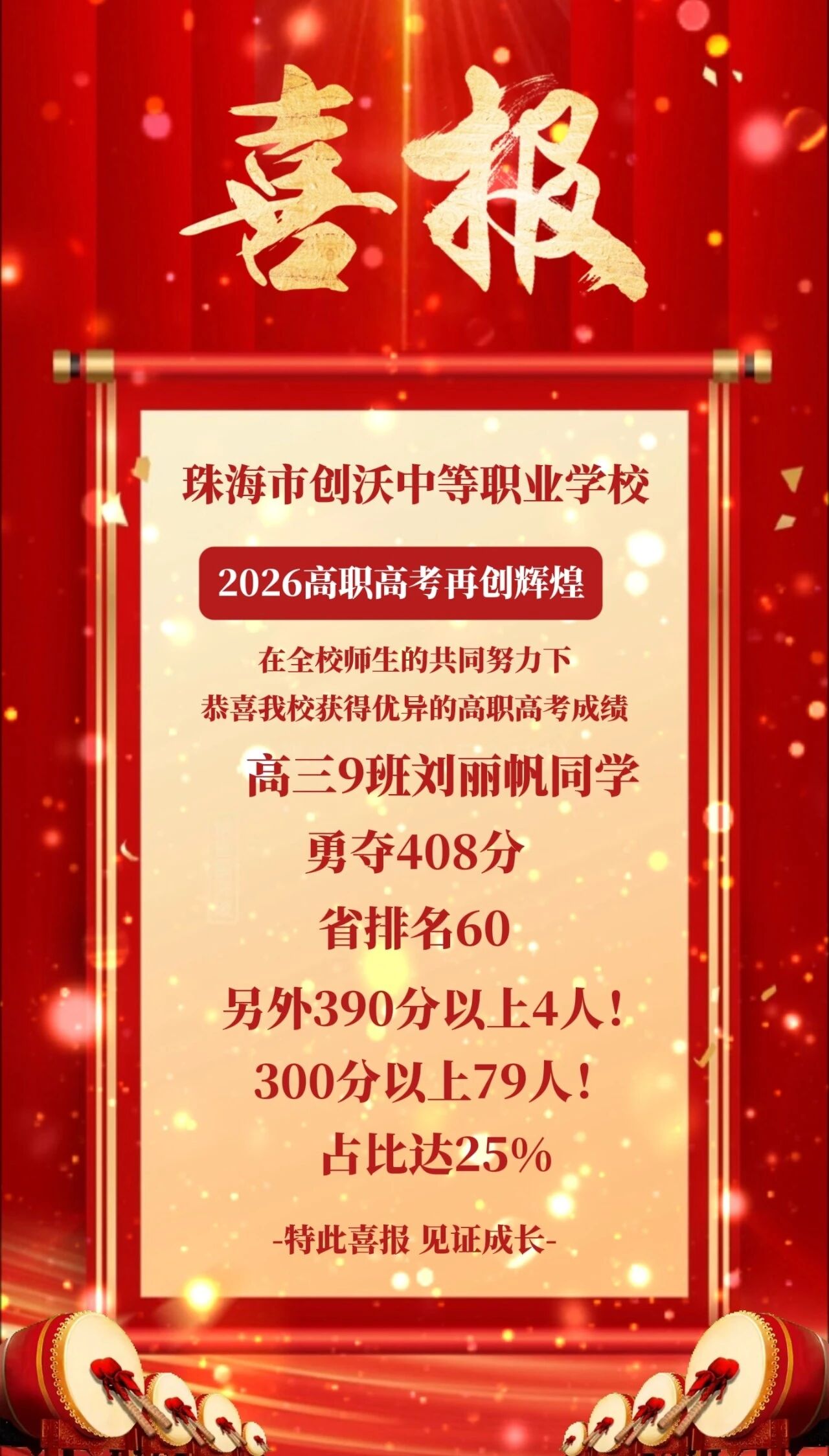 耕耘终得回响,拼搏铸就非凡。在这个承载希望与收获的季节,我们满怀喜悦与自豪,与您分享珠海市创沃中等职业学校2026届高职高考的辉煌喜讯!
